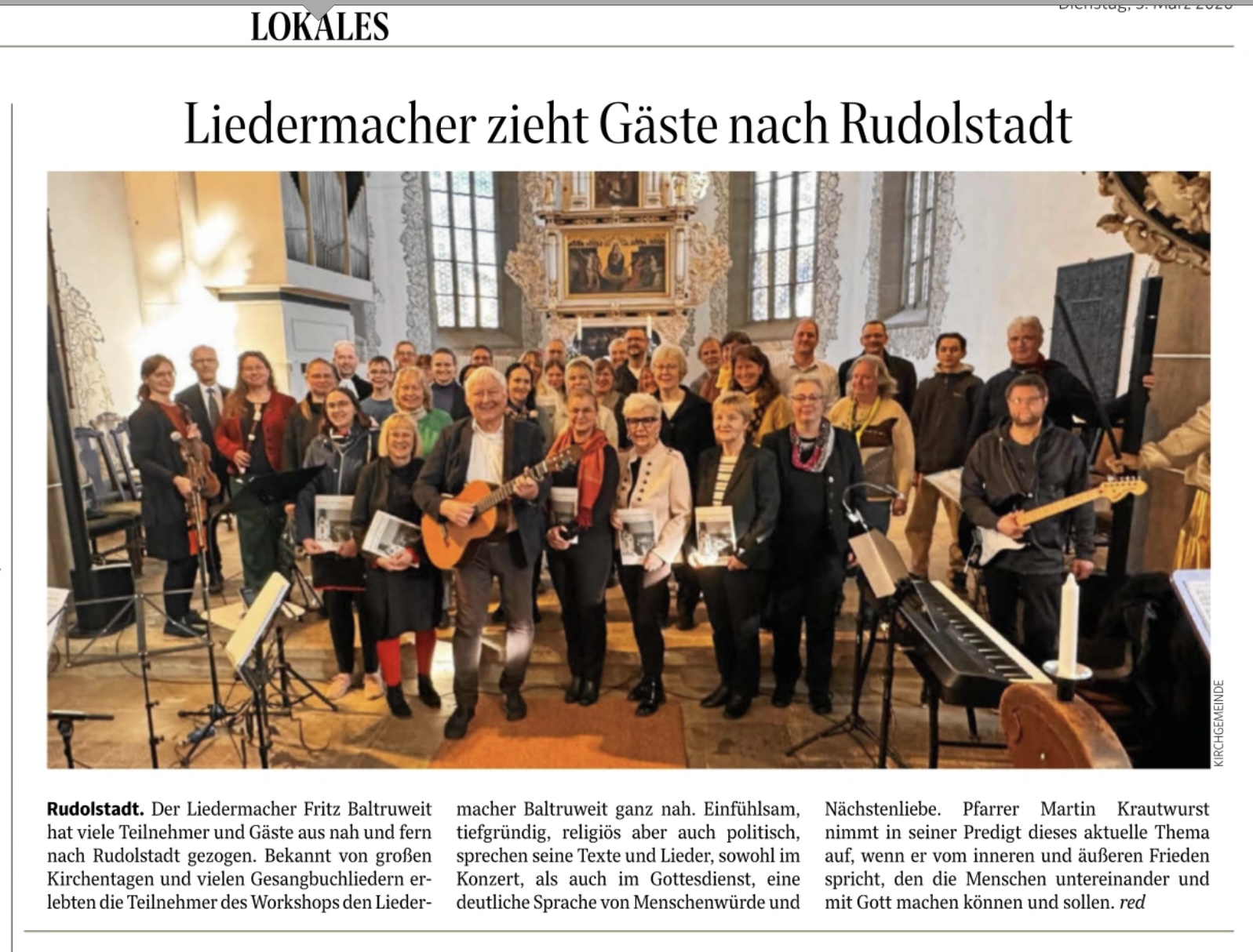 - Darüber habe ich mich gefreut: Simon Benne weist in der Hannoverschen Allgemeinen Zeitung auf unser Lied zur Kirchentagslosung hin – mit einem Video des Songs, mitgeschnitten bei einer Veranstaltung im Garten von Landesbischof Meister. Die Noten von unserem Kirchentagslied finden Sie hier. Er schreibt: „’Mutig, stark, beherzt‘: Der Song zum Kirchentag in Hannover 2025 von Liedermacher Fritz Baltruweit und Texter Lothar Veit passt zur Stimmung der Zeit. Der Text ist politisch – und zugleich spirituell: „Mutig, stark, beherzt“ ist der Song zum Kirchentag 2025 in Hannover. Die Musik stammt vom hannoverschen Pastor und Kirchenliedermacher Fritz Baltruweit. Der Text von Lothar Veit thematisiert die Probleme, die unsere Welt erschüttern, und die Ohnmacht, die einzelne dabei empfinden.“- Ja, der Kirchentag schlägt „Wellen“. In Fredelsloh hat wir ein wunderschönes „Vorkonzert“ zusammen mit Jan von Lingen, Lothar Veit und dem Jugendchor St.Sixti Northeim. Einen kleinen Eindruck bekommen Sie hier. Und jetzt ist auch „unser eigenes“ Video, das von Lothar Veit, zu sehen :-)